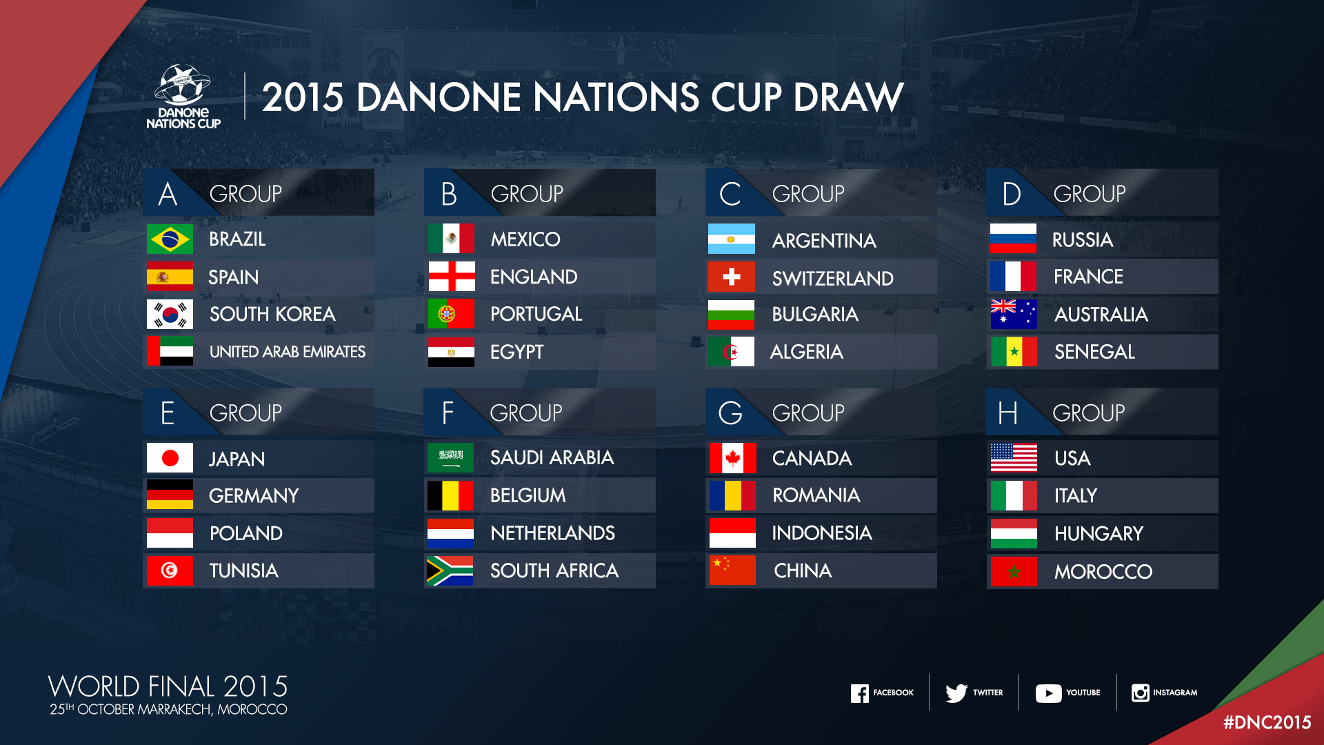 أُجريت اليوم الجمعة قرعة نهائيات كأس دانون للأمم 2015 والتي ستحتضنها المملكة المغربية ما بين 23 و25 أكتوبر المقبل في الملعب الكبير بمراكش.