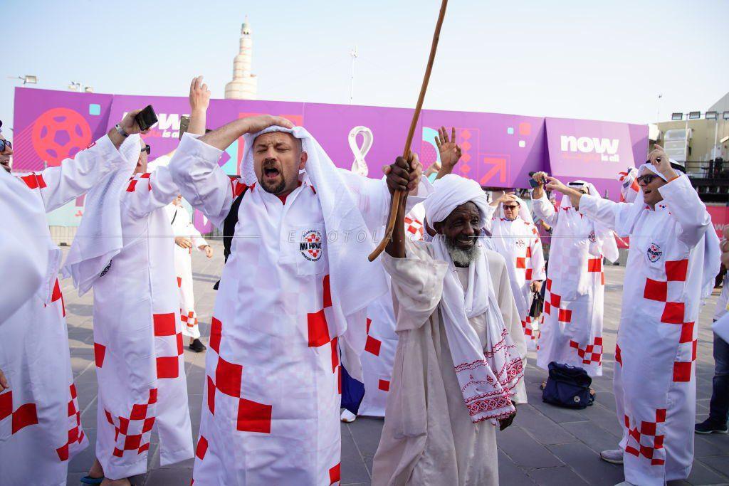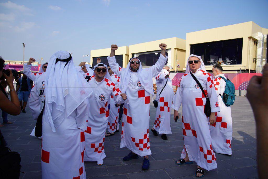 ورصدت عدسات الكاميرا جماهير "فاتريني"، وهم يرتدون الزي التقليدي الخاص بقطر "الثوب الأبيض والعقال"، مزينًا بألوان العلم الكرواتي، في جو من الاحتفال بالمونديال.