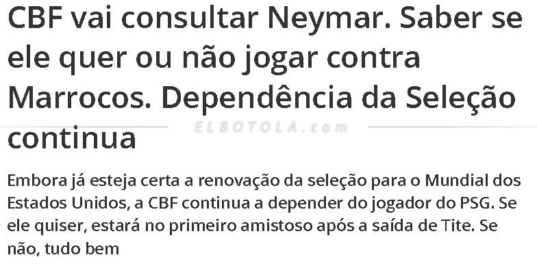 وأكدت قناة "Record TV" البرازيلية أن اتحاد الكرة المحلي سيستشير نيمار، لاعب باريس سان جيرمان الفرنسي، إذا كان يريد اللعب أمام المغرب، مشيرة إلى أن منظمي المباراة الودية يرغبون بتواجده في ملعب طنجة الكبير.