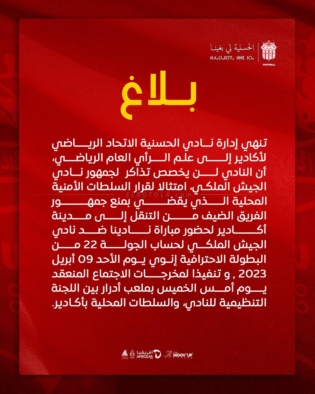 ونشر الحساب الرسمي للحسنية على موقع التواصل "فيسبوك"، بلاغاً يؤكد فيه عدم تخصيص أي تذاكر لجماهير الجيش، وذلك "امتثالا لقرار السلطات الأمنية المحلية الذي يقضي بمنع جمهور الفريق الضيف من التنقل إلى مدينة أكادير".