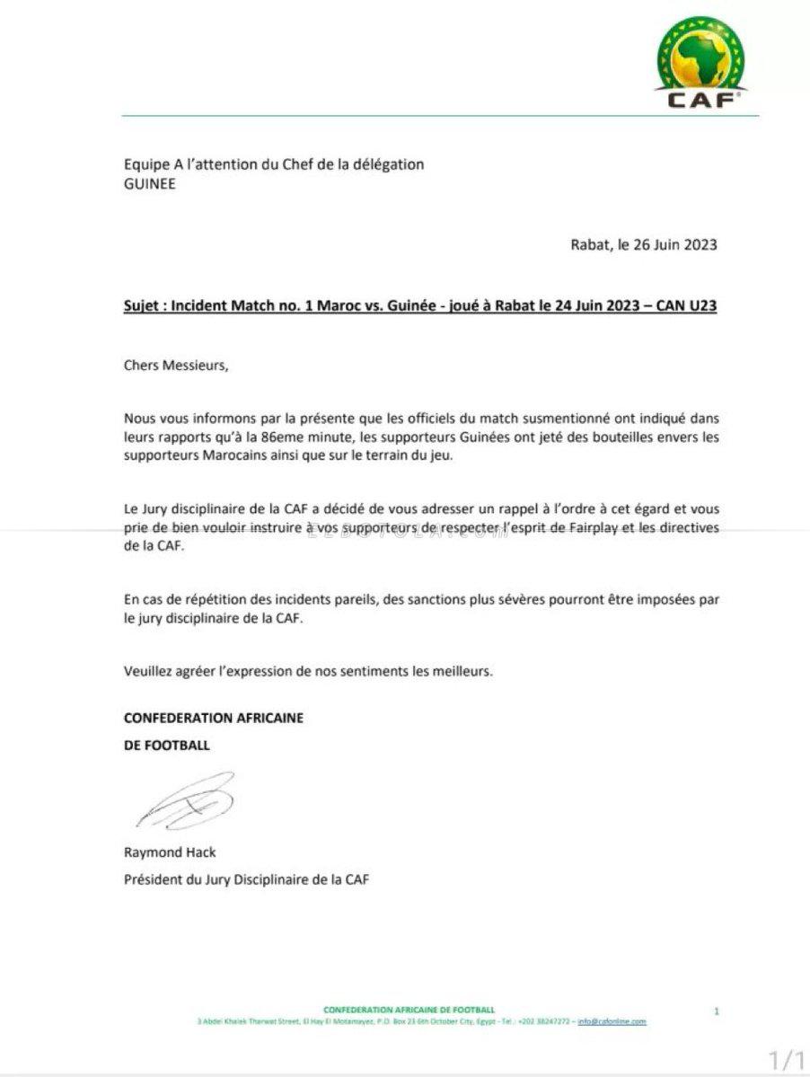 نبه الاتحاد الأفريقي لكرة القدم، يومه الثلاثاء، نظيره الغيني، بعد مخالفتهم لقواعد الروح الرياضية، خلال مواجهة المغرب وغينيا، برسم الجولة الأولى من المجموعة الأولى لـكأس أمم أفريقيا لأقل من 23 سنة.