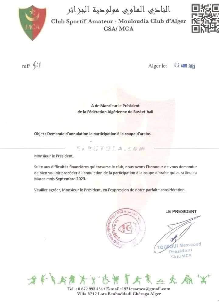 راسلت إدارة مولودية الجزائر لكرة السلة الاتحاد المحلي للعبة، لطلب إعفائها من المشاركة في البطولة العربية لكرة السلة المقامة بالمملكة المغربية شهر شتنبر المقبل.