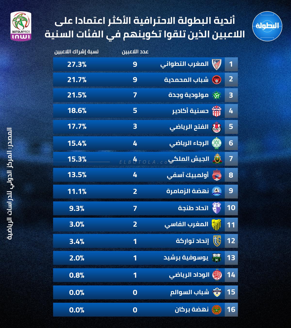 وأجريت الدراسة على أغلب دوريات العالم، بما فيها البطولة الاحترافية "إنوي"، ومن خلالها جاء فريق المغرب التطواني في صدارة الأندية المغربية، حيث يتوفر في صفوفه، على 9 لاعبين تلقوا تكوينهم في النادي.