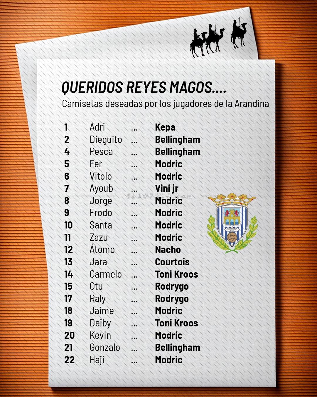 أرسل أراندينا الإسباني المنافس في الدرجة الرابعة، قائمة لقمصان ريال مدريد التي يرغب كل لاعب في الفريق الحصول عليها، بعد نهاية المباراة التي ستجمع الطرفين لحساب دور الـ32 من كأس ملك إسبانيا.