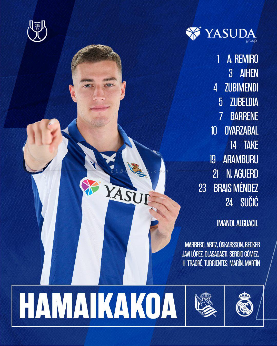 كشف إيمانويل ألغاسيل، مدرب ريال سوسيداد، التشكيلة الأساسية التي سيدخل بها مباراة اليوم (20:30 غرينيتش+1)، عندما يستقبل فريقه ضيفه ريال مدريد، برسم ذهاب نصف نهائي كأس ملك إسبانيا.