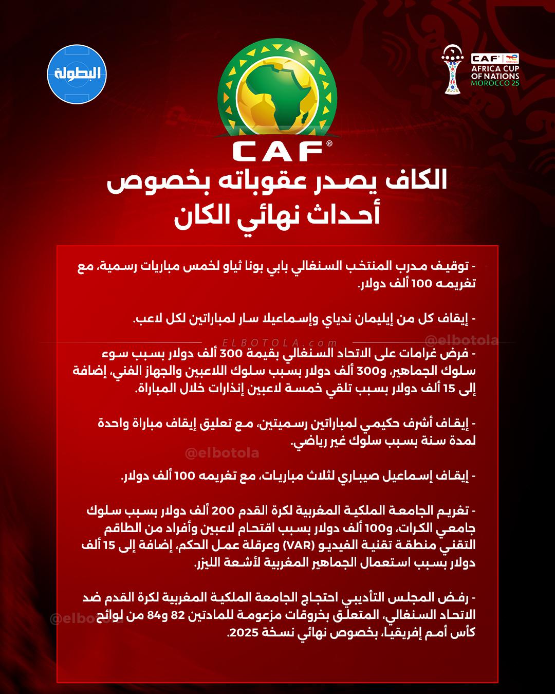 وفي السياق ذاته، شملت قرارات اللجنة الانضباطية توقيف لاعبي السنغال إيليمان نداي وإسماعيلا سار لمباراتين، إضافة إلى غرامات مالية ثقيلة في حق الاتحاد السنغالي بسبب سلوك الجماهير والطاقم التقني، كما طالت العقوبات المنتخب المغربي بإيقافات وغرامات مالية، على خلفية أحداث متفرقة شهدها النهائي.