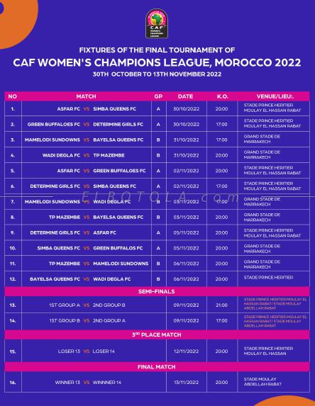 La Confédération Africaine de Football (CAF) vient d’annoncer le programme de la ligue des champions féminine, prévue entre le 30 octobre et le 13 novembre au Maroc, avec la participation de l’équipe féminine de l’AS FAR qui va disputer le match de l’ouverture officielle contre Simba Queens le 30 octobre.